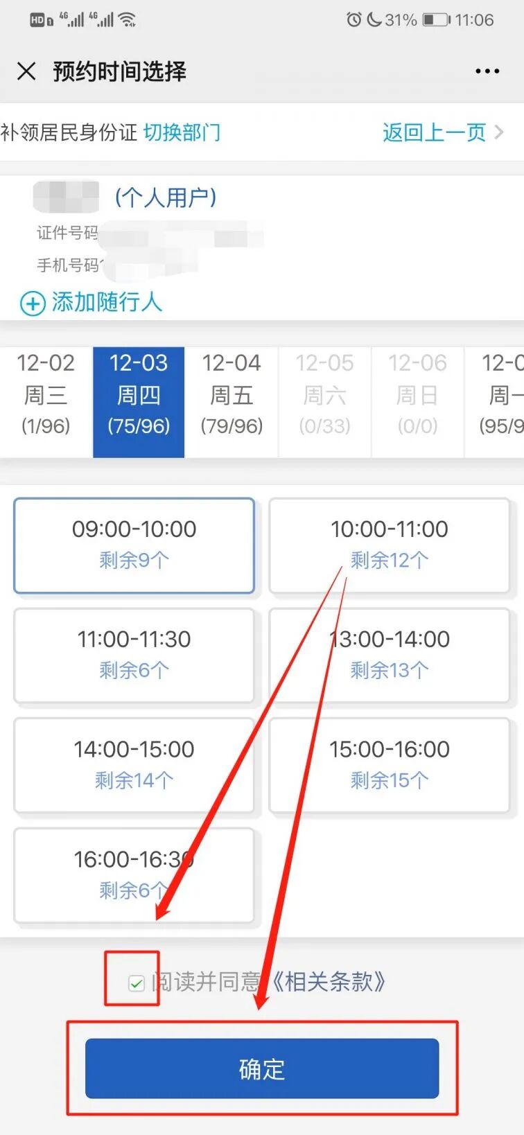 第七步:选择要预约的日期和时间段,勾选同意并点击确定,最后根据系统提示完善信息即可。