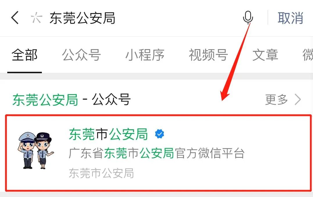 第一步:在微信搜索“东莞市公安局”,关注东莞市公安局微信公众号;